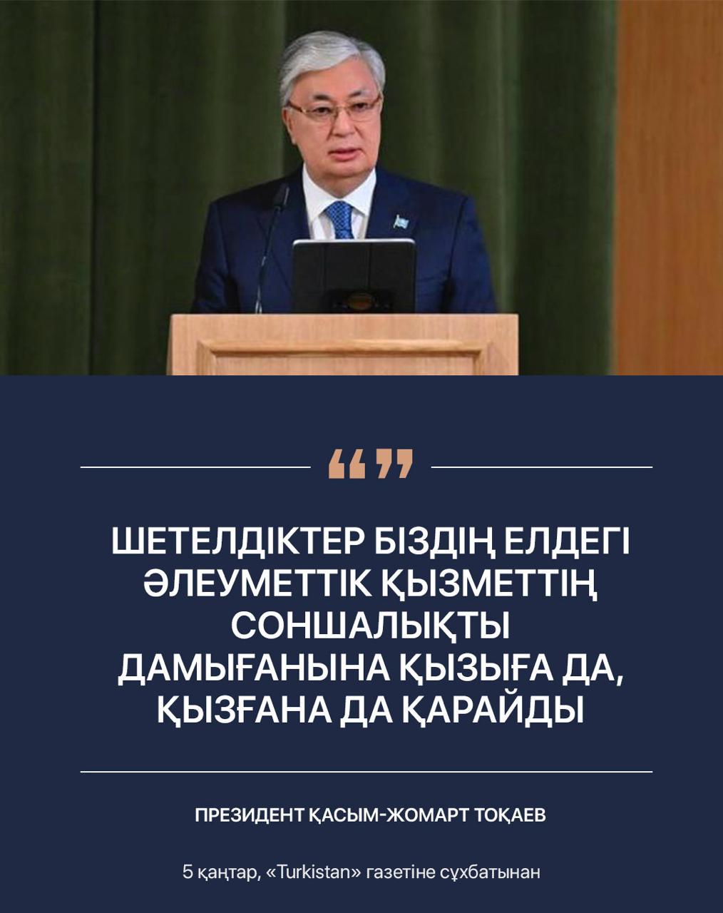 Ел Президенті “Түркістан” газетіне берген сұхбатында біздің елде әлеуметтік слаға айрқыша көңіл бөлініп отырғанын айтты. “Сырт көз – сыншы» деген сөз бар. Шетелдіктер, әсіресе, көрші мемлекеттердің тұрғындары біздің елдегі әлеуметтік қызметтің соншалықты дамығанына қызыға да, қызғана да қарайды. Соның ішінде кепілдік берілген тегін медициналық көмек және азаматтарға арналған көптеген жеңілдік бар” деді. Қазақстан өзін әлеуметтік мемлекет ретінде айқындаған ел. Бұл ұстаным ең алдымен азаматтардың әл-ауқатын қамтамасыз етуге, олардың өмір сүру сапасын арттыруға бағытталған. Денсаулық сақтау, әлеуметтік қамсыздандыру, ғылым мен мәдениет салаларындағы мемлекеттік міндеттемелердің толық орындалуы – осы саясаттың нақты көрінісі.