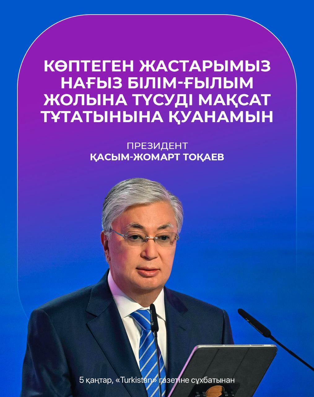 Президент “Түркістан” газетіне берген сұхбатында елдегі ғылымның дамуына айрықша назар аударды. Бұл салада ауыз толтырып айтарлық даму барын атап өтті. Әсіресе жастардың ғалым болуға жиі бет бұратынына қуанатынын жеткізді. “ Көптеген жастарымыз нағыз білім-ғылым жолына түсуді мақсат тұтатынына қуанамын” деді Мемлекет басшысы.