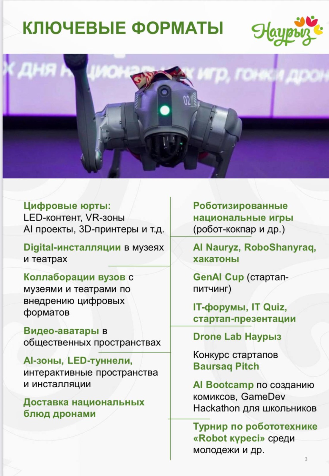 Празднование Наурыза в Казахстане в этом году прошло в кардинально новом высокотехнологичном формате. Традиционные юрты сменились цифровыми пространствами с VR-зонами и AI-проектами, а привычные состязания переросли в турниры по робототехнике «Robot күресі» и «робот-кокпар». На улицах городов появились видеоаватары и LED-туннели, а доставку национальных блюд в ряде локаций доверили дронам. Программа праздника также включила в себя серию хакатонов, стартап-питчинги Baursaq Pitch и образовательные AI-интенсивы для молодежи, превратив весенний праздник в масштабный технологический фестиваль.