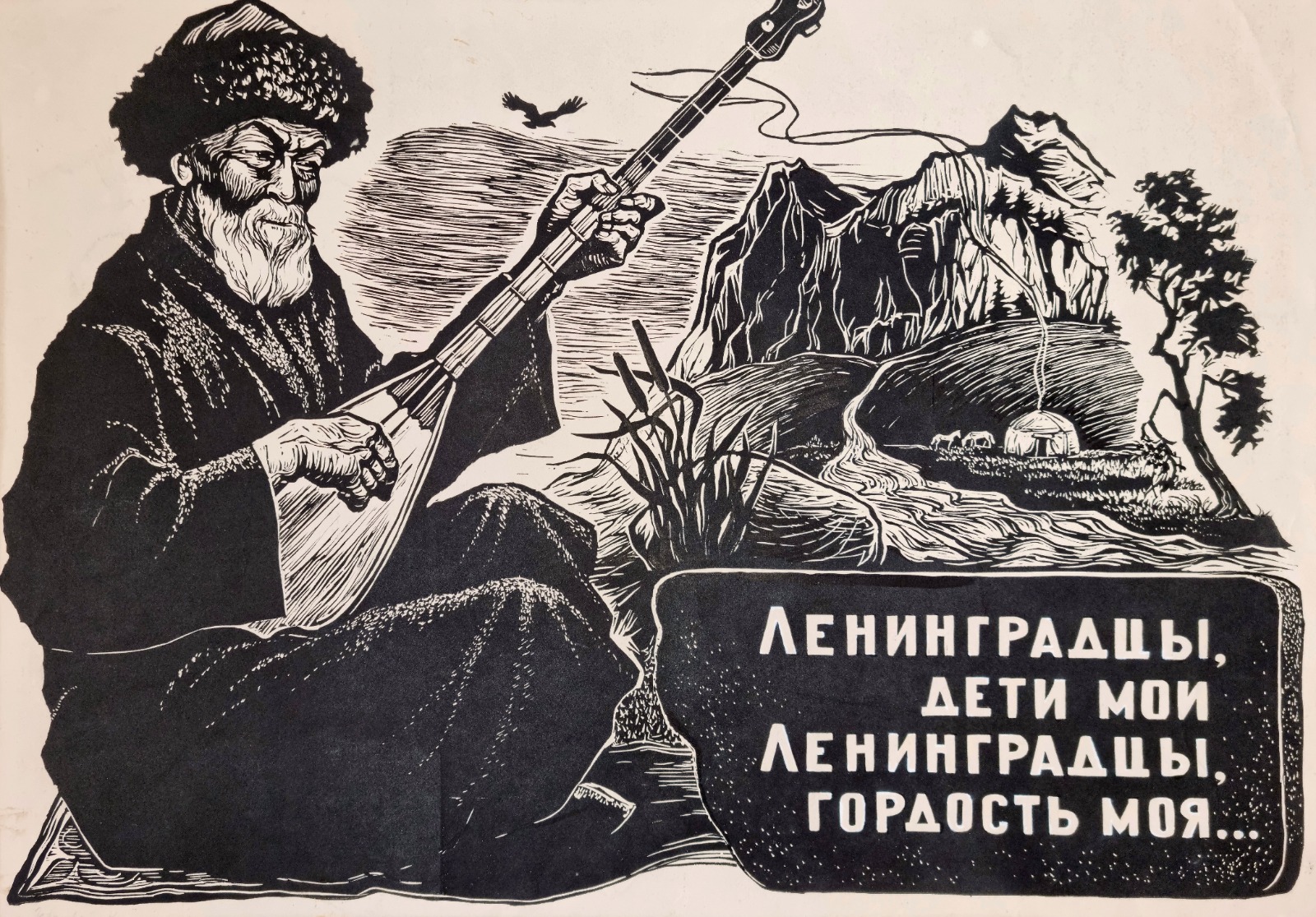 1941-1945 жылдары халқымыз үшін бұл күндер – зұлмат күндер болды. Ленинград қаласы 900 күн бойы блокадада жау құрсауында болған кезде жауынгерлерге рух беру мақсатында осы «Ленинградтық өренім» өлеңі шыққан еді. Мұнда суретші екі ақ түсті пайдалана отырып қаншама мағына бере білген Жамбыл атамыз қолында домбырасы бар, бейбіт замандағы қазақтың ауыл көрінісі, киіз үйі, мұржадан жанып жатқан оттың түтіні шығып жатыр, бұл тіршіліктің нышаны, киіз үй қасында ат байлаулы тұр, орман, тау-тас, ағаштар, ұшқан құстар тамаша табиғат көрінісі адам мен табиғаттың арасындағы үйлесімділік керемет суреттелген. Ақынның қолданысындағы «Ленинградтық өренім» тіркесі – алыстағы құрсауда қалған қара халқын өз туған бауырындай сезінген ұлы бабаның ғана аузынан шығатын ыстық сөз. Бұл жұртқа жігер сыйлаған өлең.